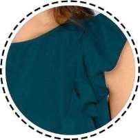 8 Attributes: SKU: Nozy Paris 1499 (as seen in image) Fabric: Ajanta (95% Polyester, 5% Spandex) Color: Teal Blue Pattern: Solid Sleeve Style: Ruffle Cap Sleeve (inside attached) Neckline: Round Neck Length: 51 Inches Sizes: S(34), M(36), L(38), XL(40)